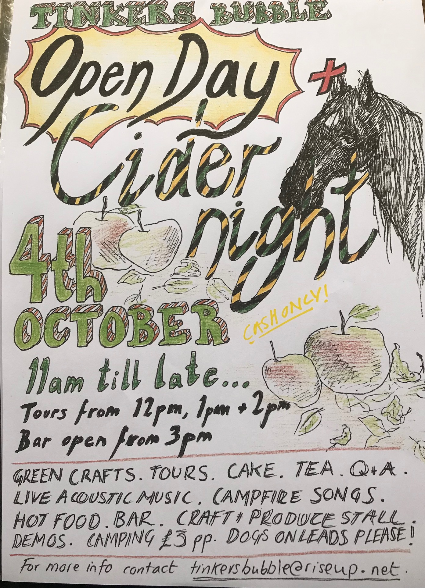A day of cider, music and food at the Tinkers Bubble Cider House (bottom of the hill, above the barn). We will be selling 9 different ciders which we have produced, both to consume on site and to take home (please bring containers!).